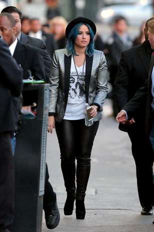 Demi Lovato desfilou seu estilo ousado nas ruas de Los Angeles (EUA), na segunda-feira (25). Na ocasião, a cantora foi clicada nas redondezas do estúdio do programa The Jimmy Kimmel Show, em que foi uma das convidadas, e optou por um casaco prata e saltos altos, além de exibir seus cabelos azuis.